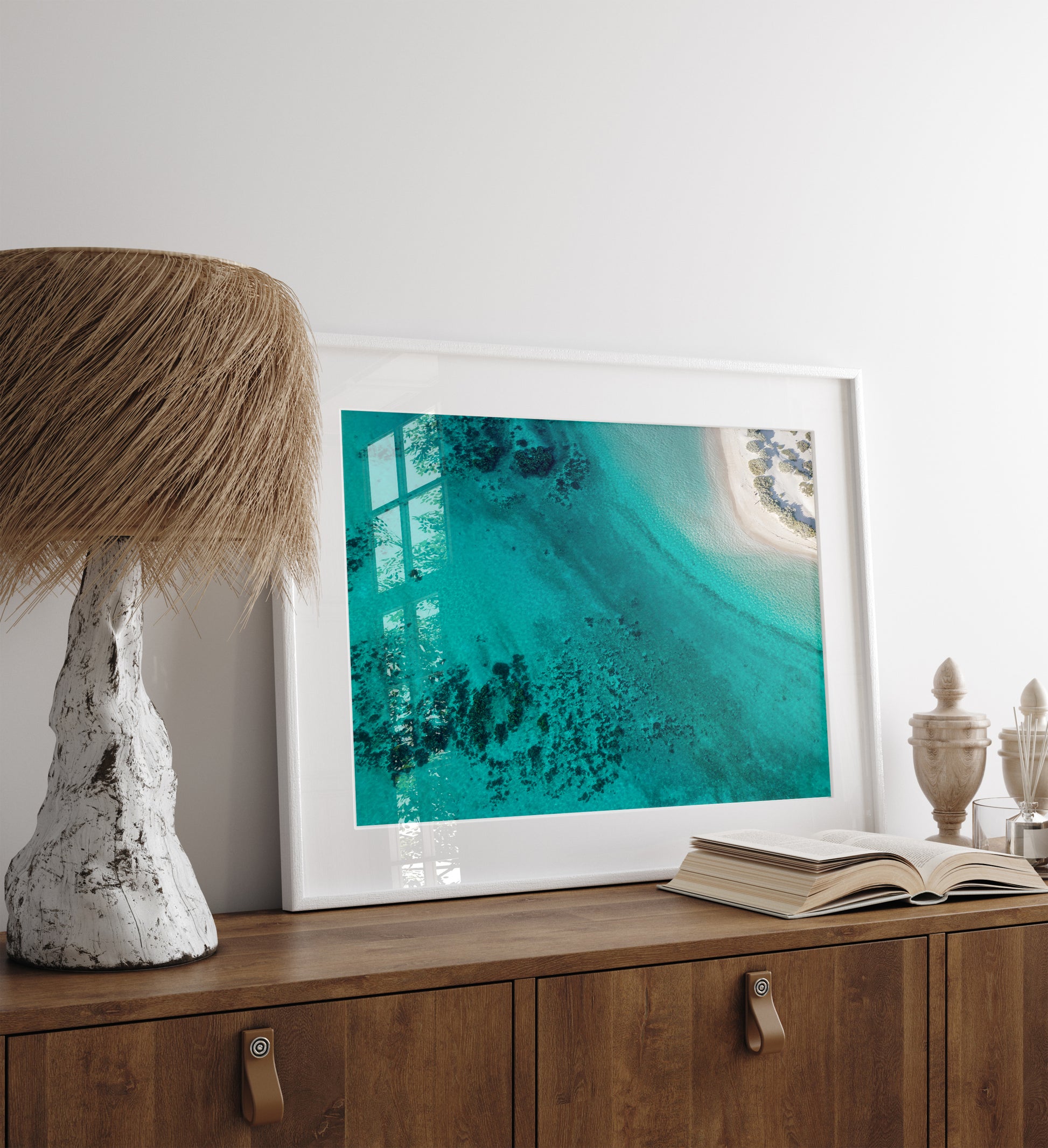 This vibrant coastal wall art photography print showcases the captivating views of the Ningaloo coastline, perfect for beach style home decor.