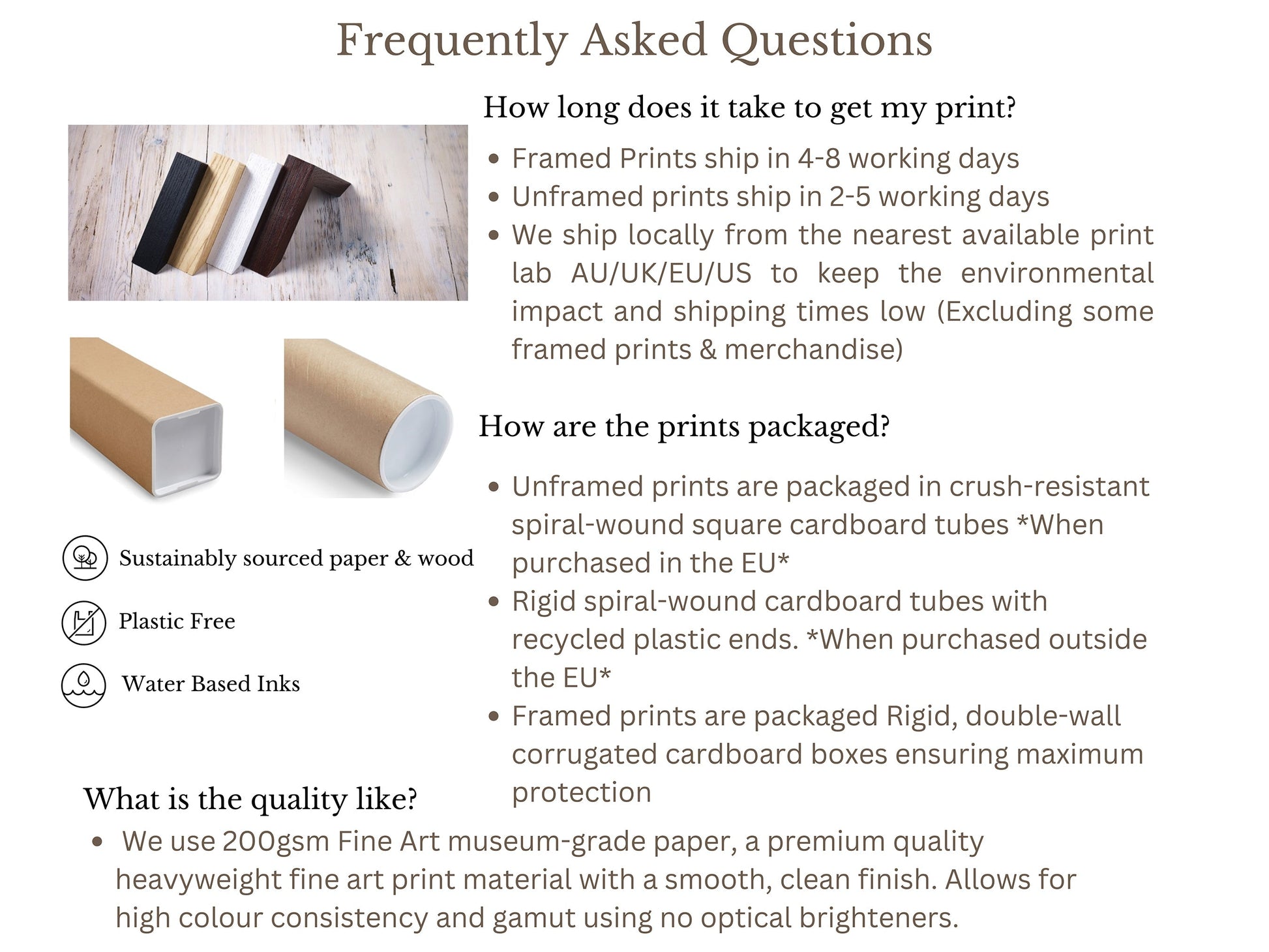 Our prints are eco-friendly using Sustainably sourced paper or wood. Plastic-free with water-based ink. We use recycled plastic ends for our unframed print packages.